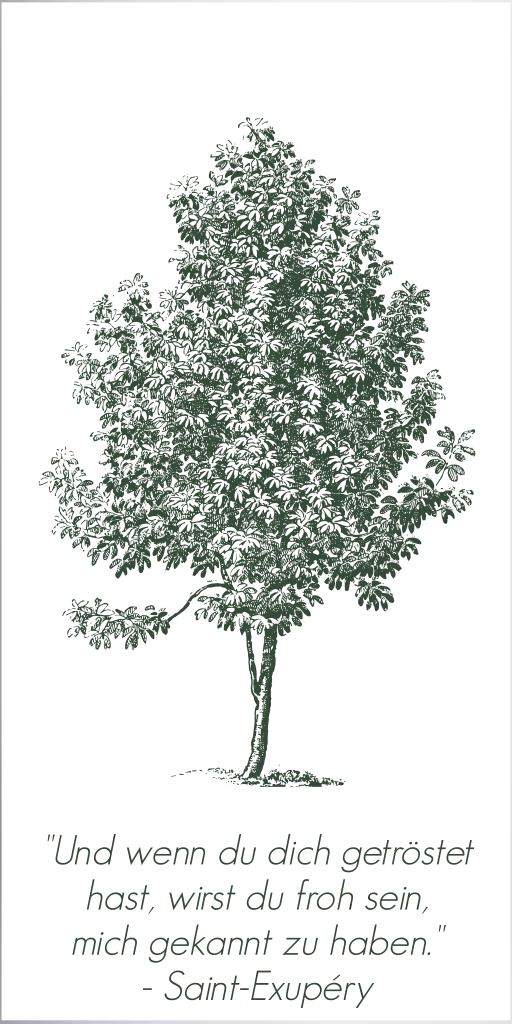 Trauerkerze mit Baum und Zitat von Saint-Exupéry