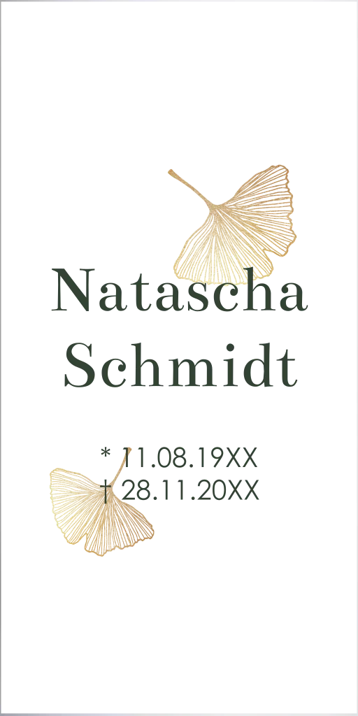 Die Ginkgo-Blätter stehen für Hoffnung und Erinnerung. Gestalte deine Trauerkerze individuell mit Namen und Datum – schlicht & stilvoll.
