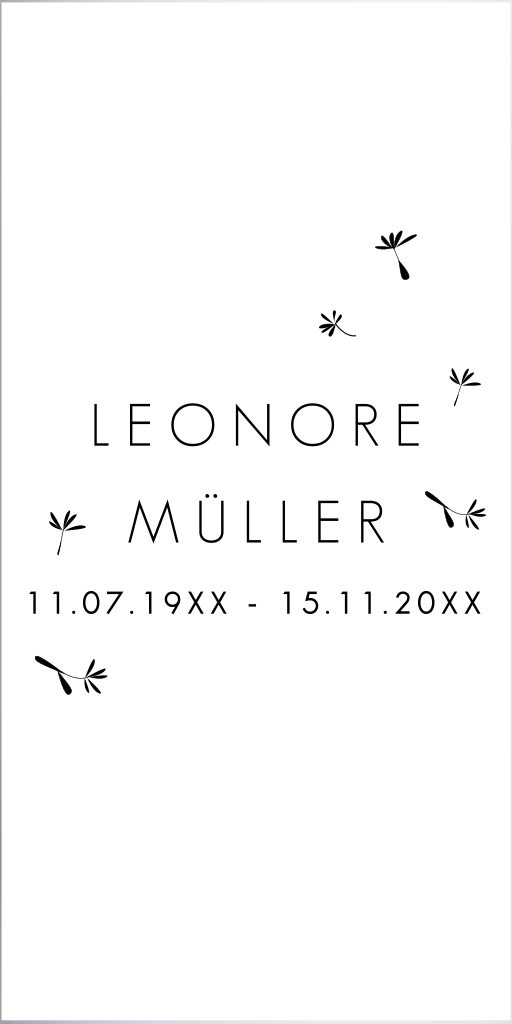 Diese moderne Gedenkkerze mit stilisierten Pusteblumen erinnert leise an einen geliebten Menschen. Mit Namen und Daten personalisierbar.