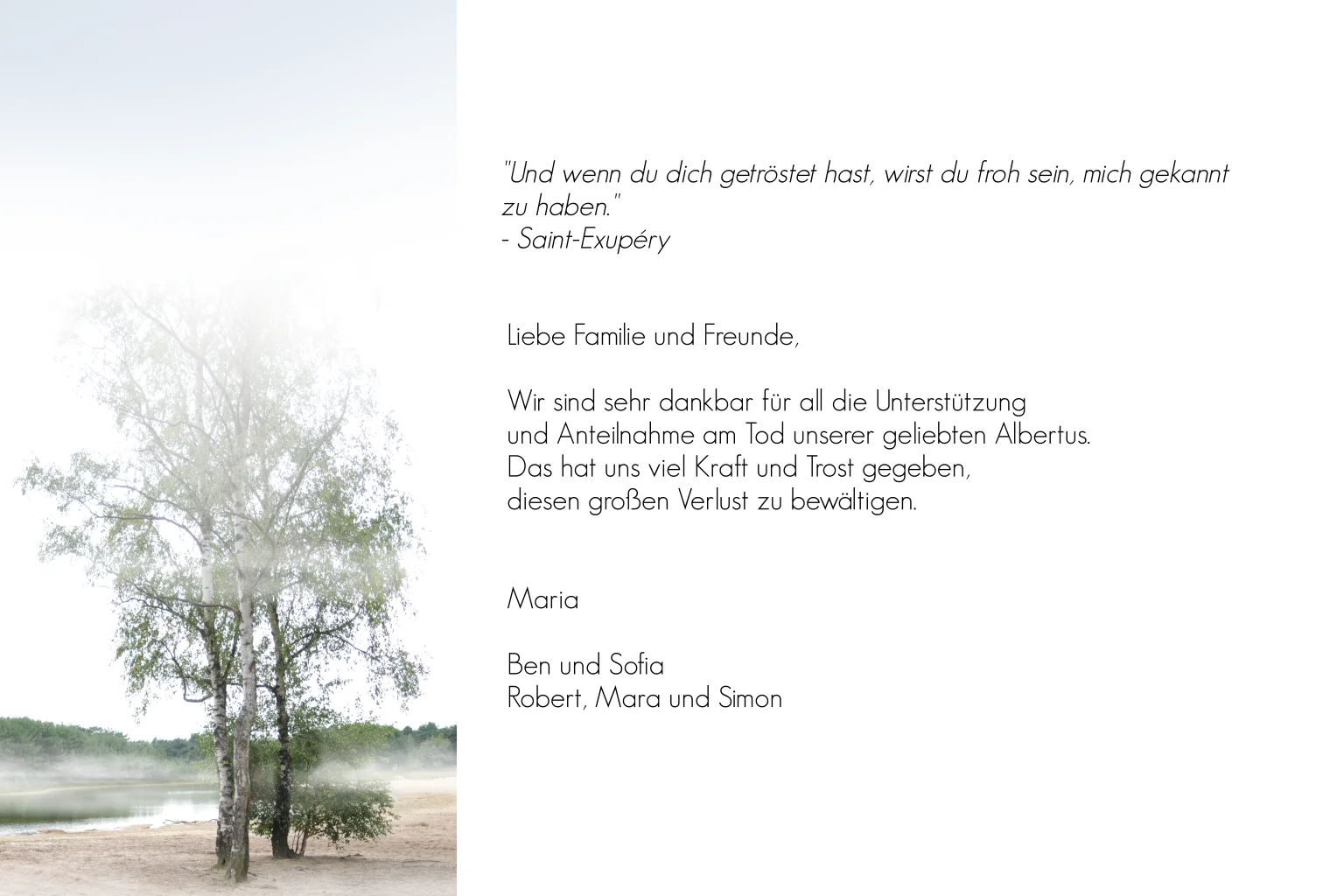 Persönliche Danksagung nach Todesfall mit stimmungsvollem Zitat von Saint-Exupéry und ruhiger Naturszene. Jetzt online gestalten.