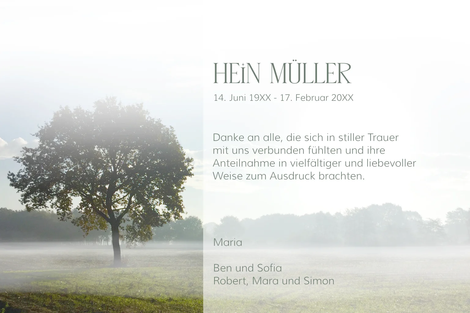 Dankeskarte Trauer mit Baum im Nebel. Bearbeiten Sie das Design einfach im Online-Editor.