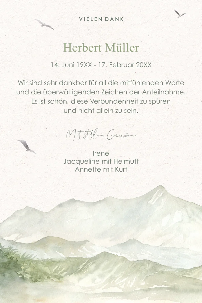 Dankeskarte Trauer in Grautönen mit Bergen und Vögeln in Aquarell. Bearbeite das Design einfach im Online-Editor.
