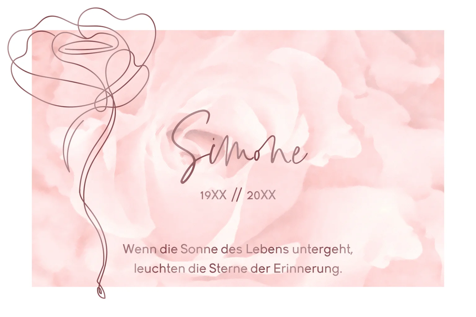 Dankeskarte Trauer mit Rose im Hintergrund und gezeichneter Blume. Passen Sie das Design in unserem Online-Editor nach Ihren Wünschen an.