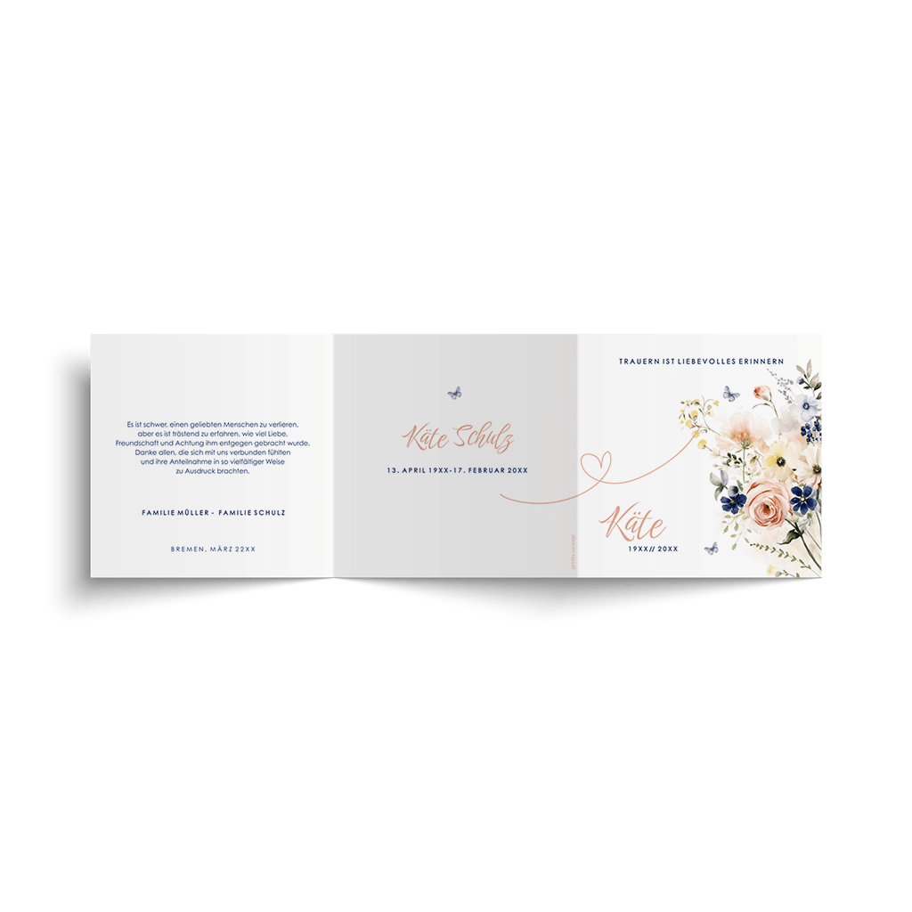 Dreiteilige Trauerdanksagung mit Blumenstrauß und Herzchen. Bearbeite das Design einfach im Online-Editor.