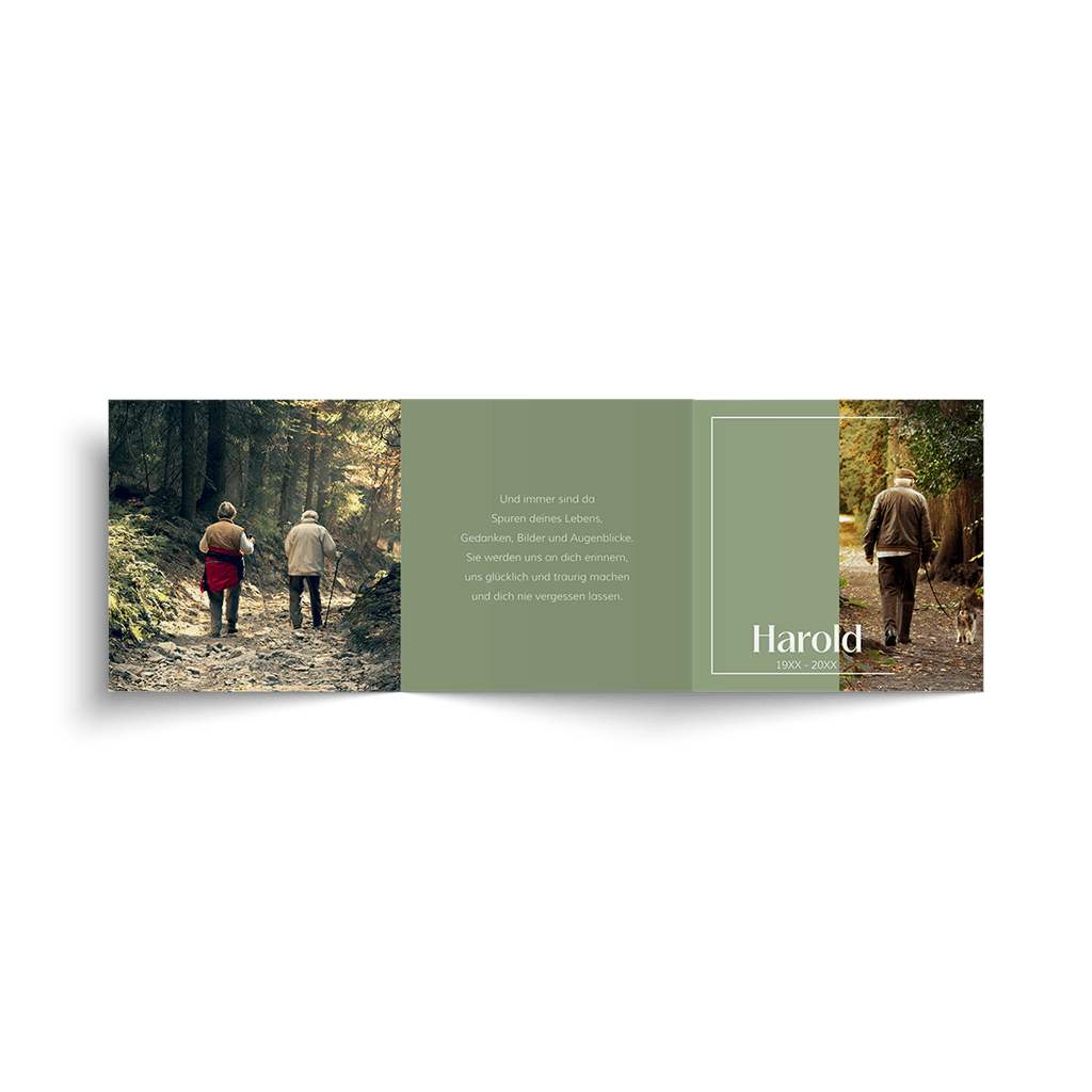 Dreiteilige Karte Trauerdanksagung in grün mit Waldspaziergang. Bearbeite das Design einfach im Online-Editor.