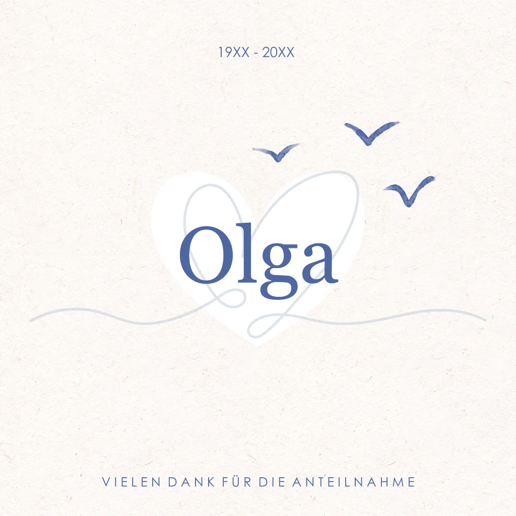 Trauer Danksagung mit gezeichneten, blauen Vögeln und Herzen