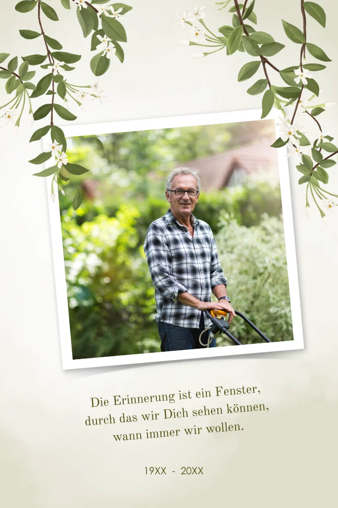 Trauerdanksagung mit hängenden Zweigen und Foto