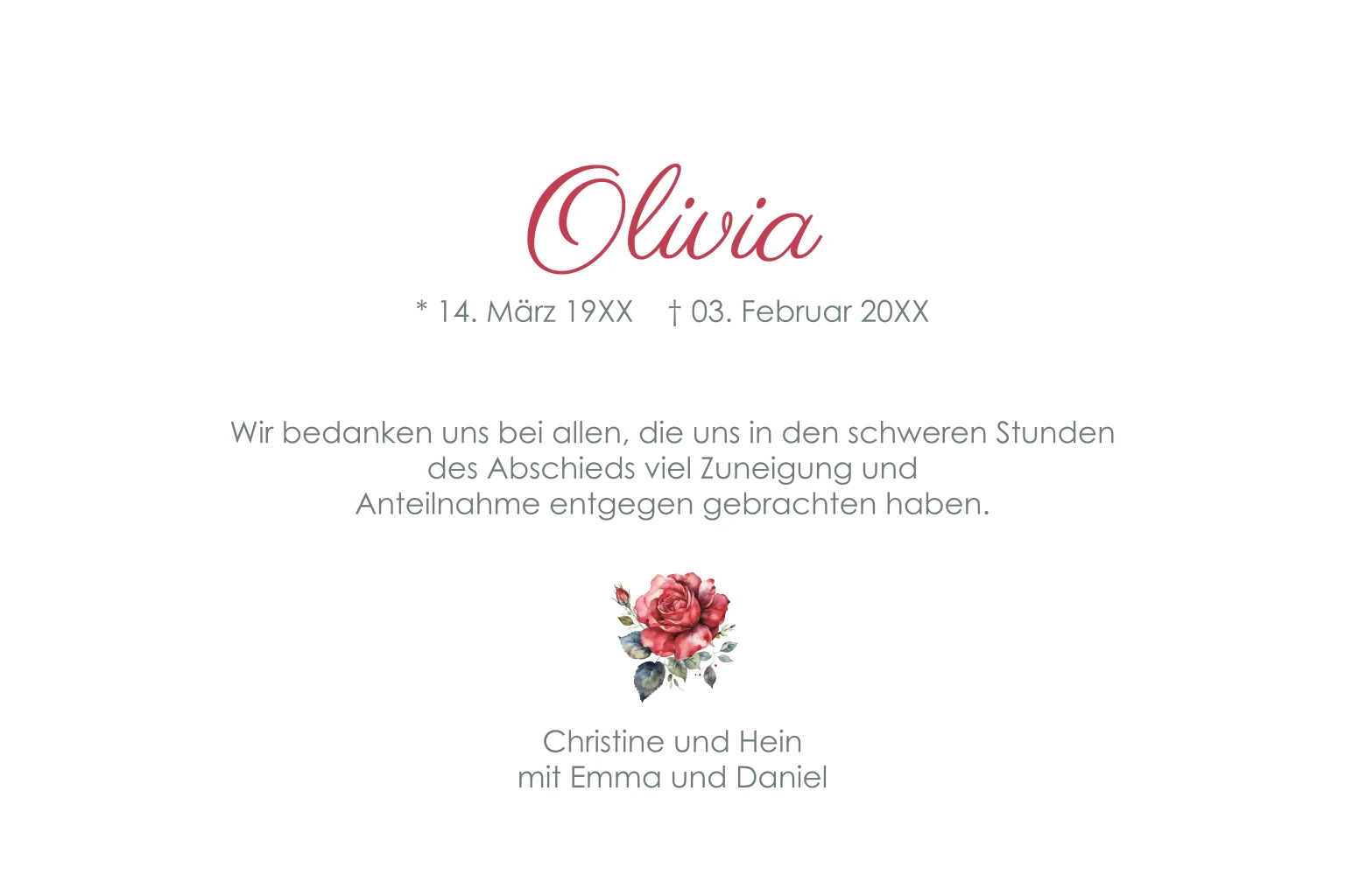 Trauerdanksagung mit roter Rose in Aquarell