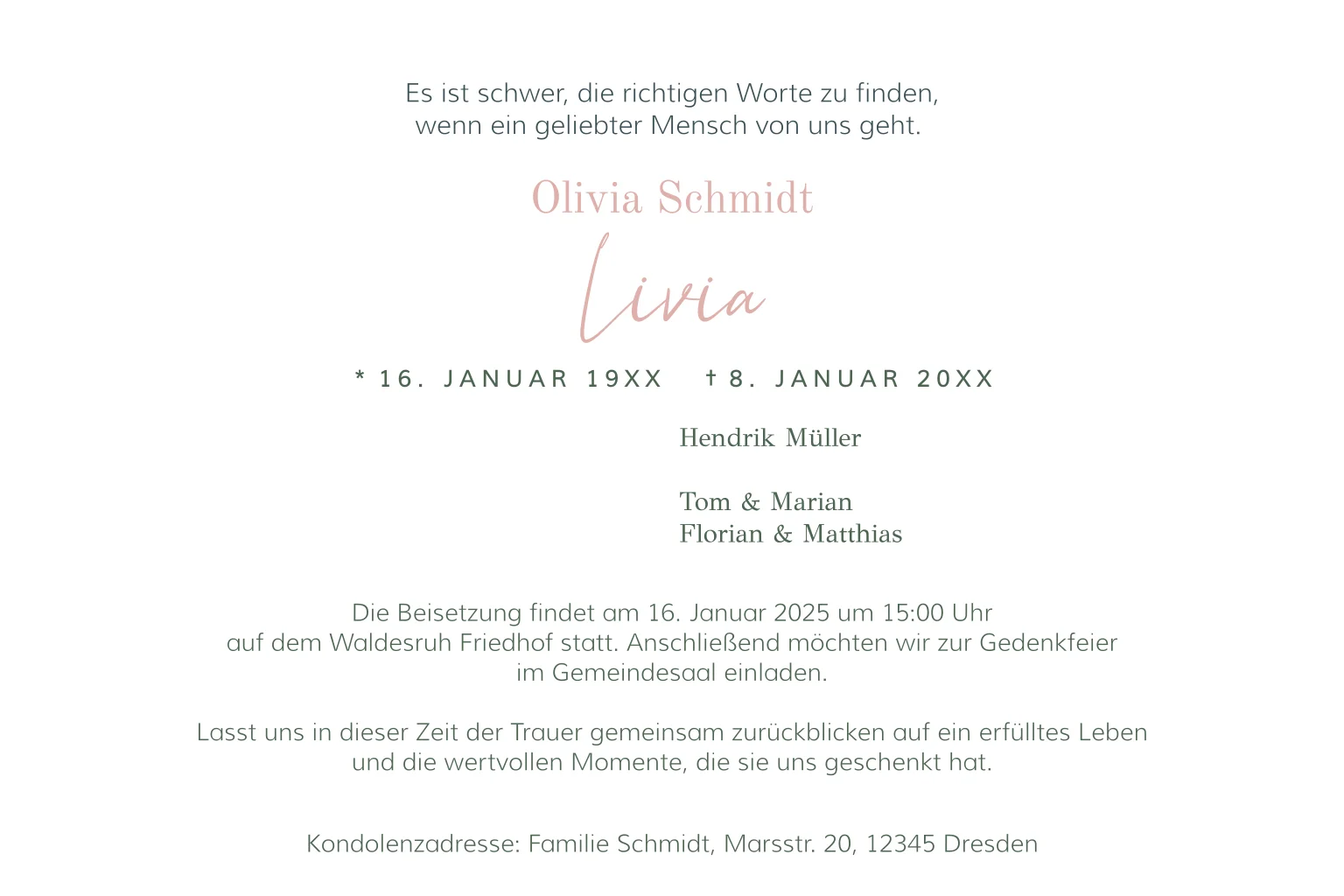 Stilvolle Trauerkarte mit blassrosa Pfingstrosen.