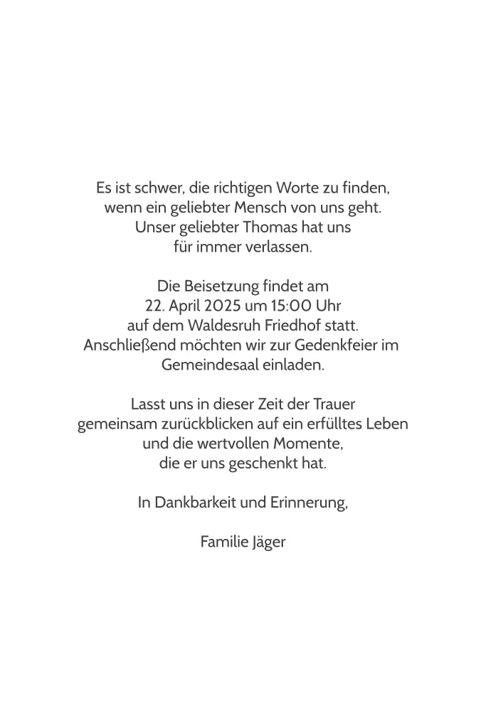 Gestalte stilvolle Trauerkarten für einen würdevollen, passenden Abschied. Entdecke unsere große Auswahl an Designvorlagen und personalisiere diese einfach und schnell in unserem kinderleichten Editor.