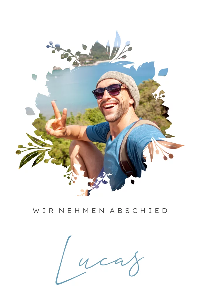 Traueranzeige mit Foto und Zweigen - Hochformat.