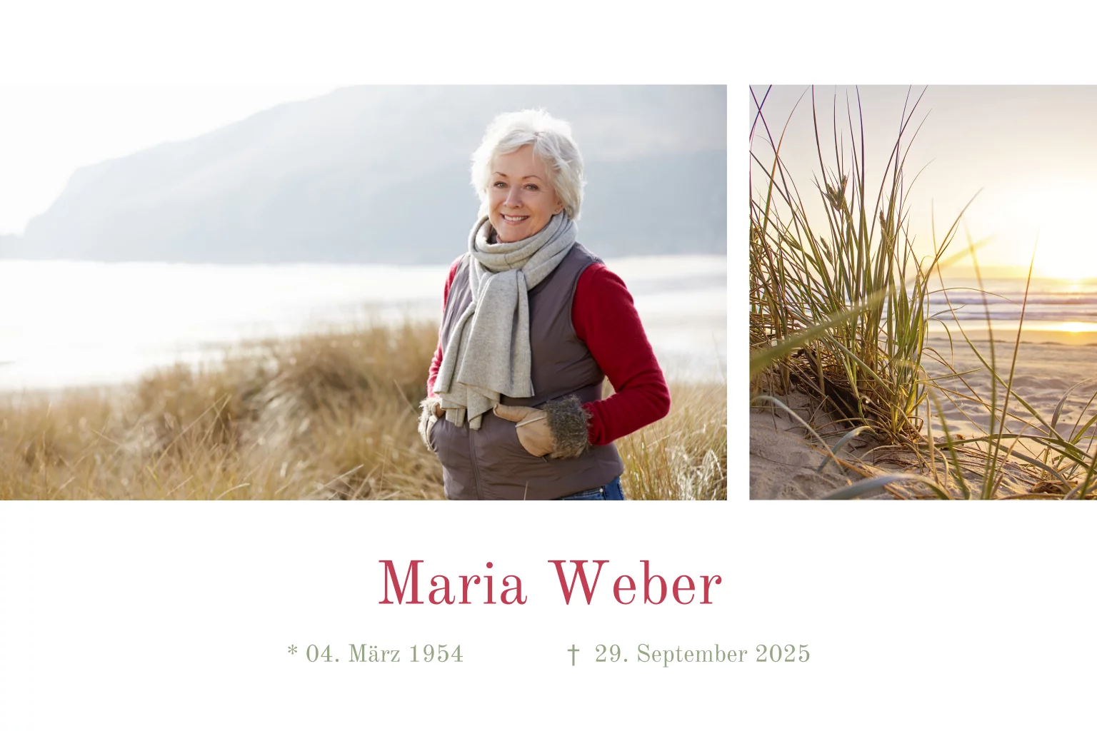 Trauerkarte "Dünen" und FotoMelde dich für unseren Newsletter an und profitiere von exklusiven Angeboten, kreativen Ideen und Neuigkeiten aus unserer Produktwelt. Als Dankeschön für deine Anmeldung schenken wir dir einen kostenlosen Probedruck deiner Karte.
