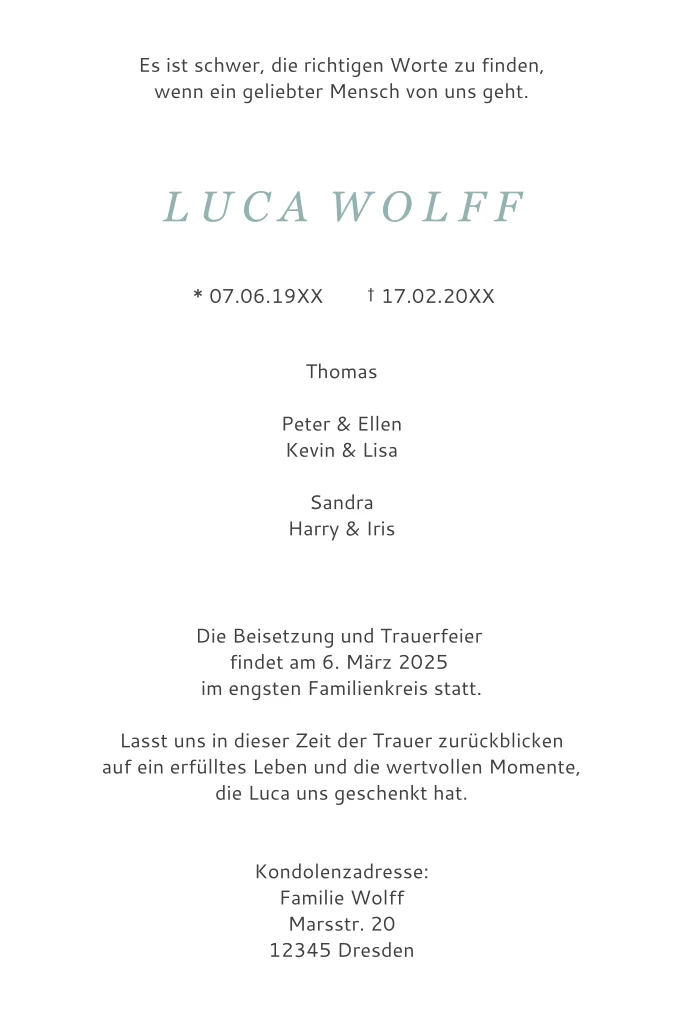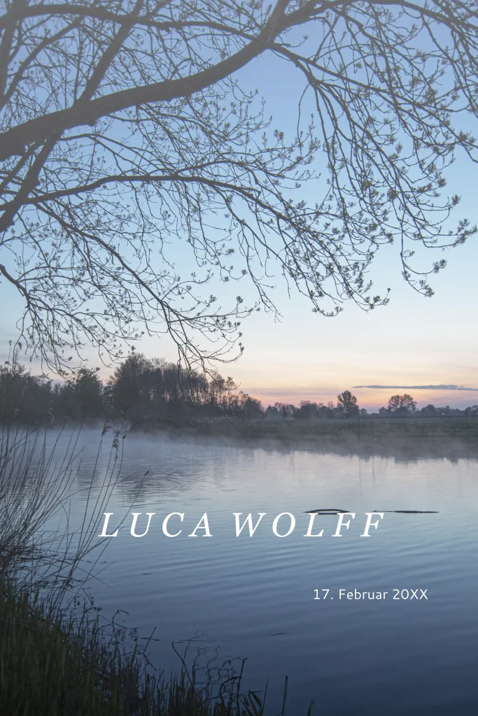 Trauerkarte mit Foto von Fluss und Bäumen im Nebel.