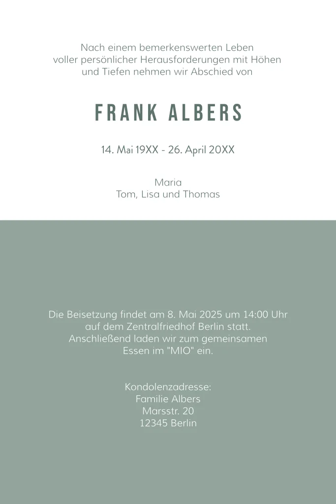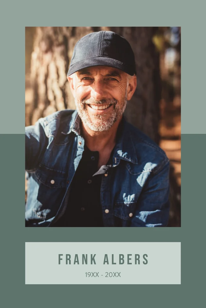Trauerkarte mit Foto und grünem Hintergrund.Das Design der von dir gewählten Karte wurde automatisch in andere Formate umgestellt. Wähle einfach deinen Wunschformat aus und platziere alle Texte und Elemente an der richtigen Stelle im Editor. Du hast Fragen oder dein Favorit steht nicht zur Auswahl? Dann kontaktiere uns bitte und wir werden uns gemeinsam darum kümmern!