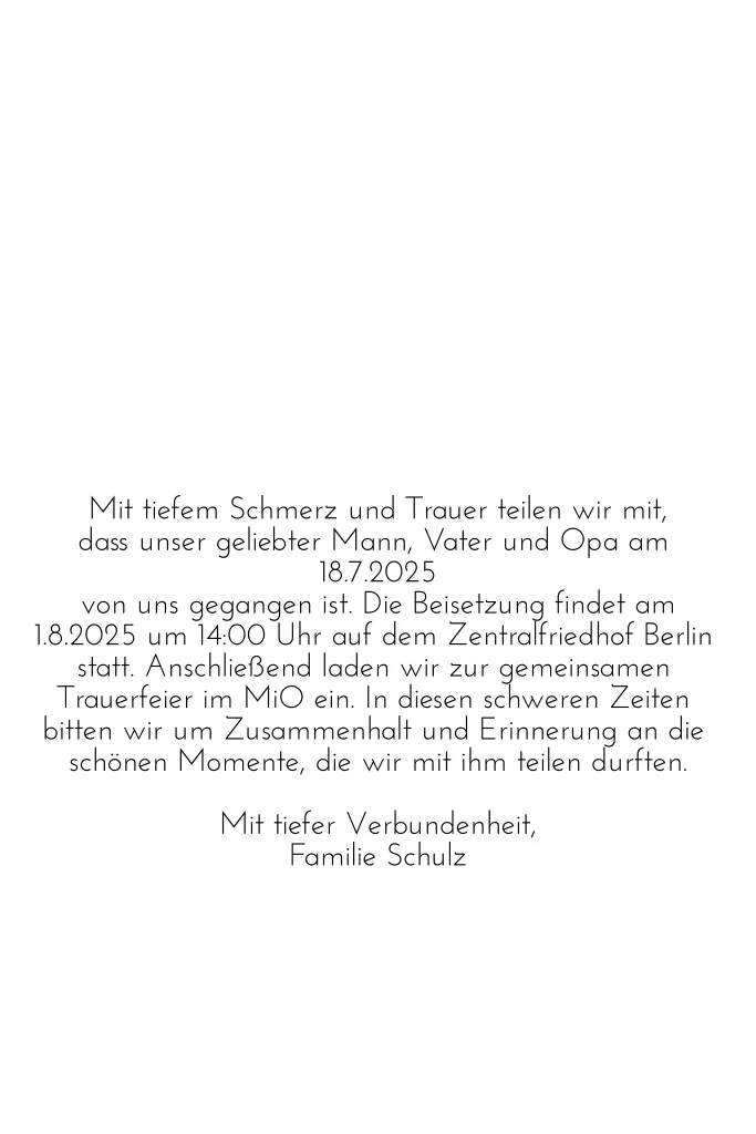 Gestalte stilvolle Trauerkarten für einen würdevollen Abschied. Entdecke unsere große Auswahl an Designvorlagen und personalisiere diese einfach und schnell in unserem kinderleichten Editor.