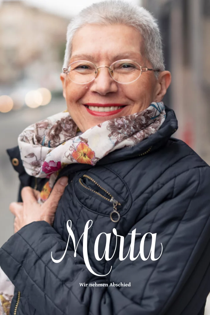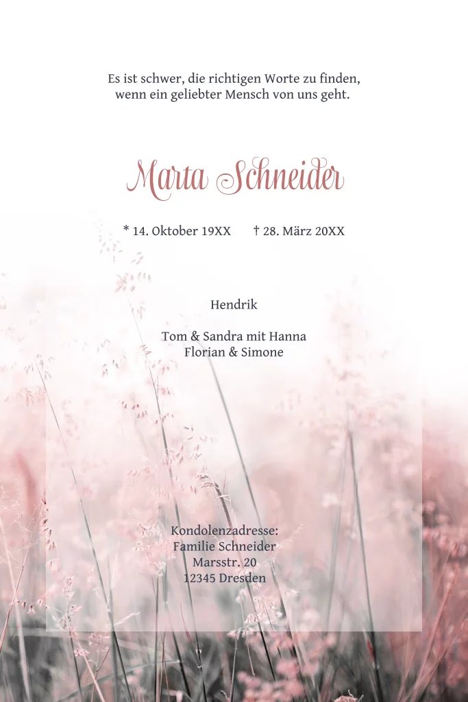 Trauerkarte mit großem Foto und floralem Hintergrund.