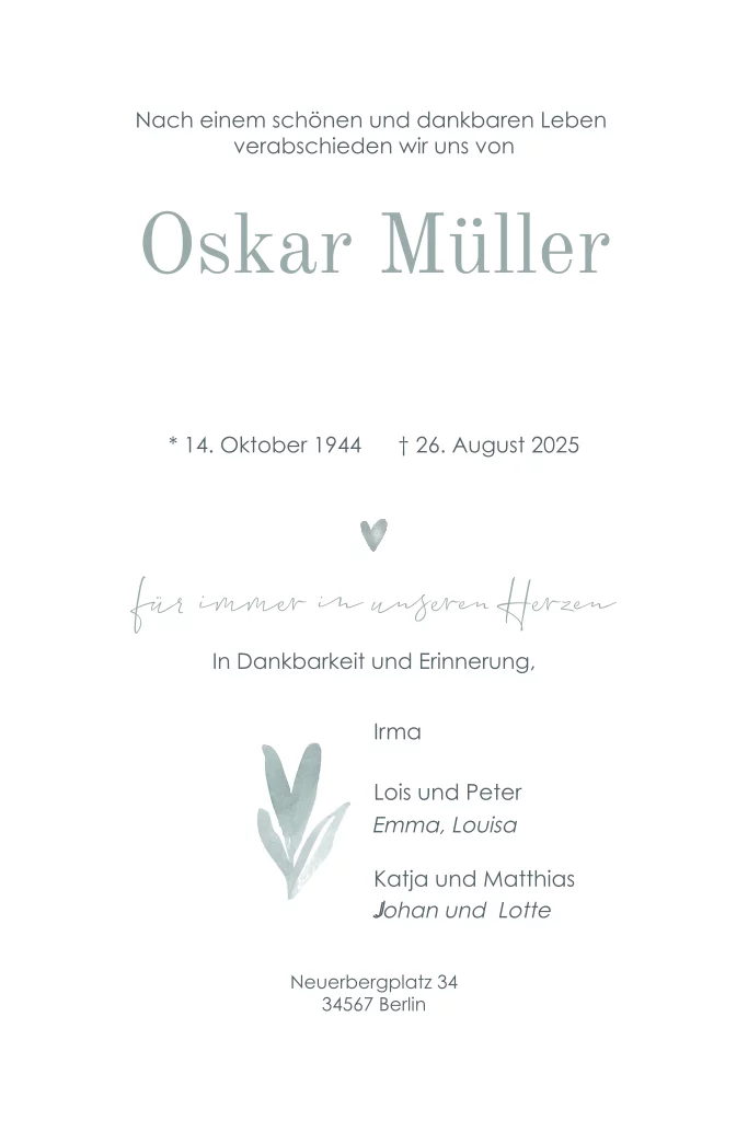 Trauerkarte mit großem Foto und weißem Rand.Melde dich für unseren Newsletter an und profitiere von exklusiven Angeboten, kreativen Ideen und Neuigkeiten aus unserer Produktwelt. Als Dankeschön für deine Anmeldung schenken wir dir einen kostenlosen Probedruck deiner Karte.