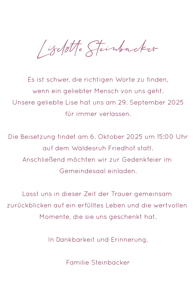 Trauerkarte in Violet mit rundem Foto.Melde dich für unseren Newsletter an und profitiere von exklusiven Angeboten, kreativen Ideen und Neuigkeiten aus unserer Produktwelt. Als Dankeschön für deine Anmeldung schenken wir dir einen kostenlosen Probedruck deiner Karte.