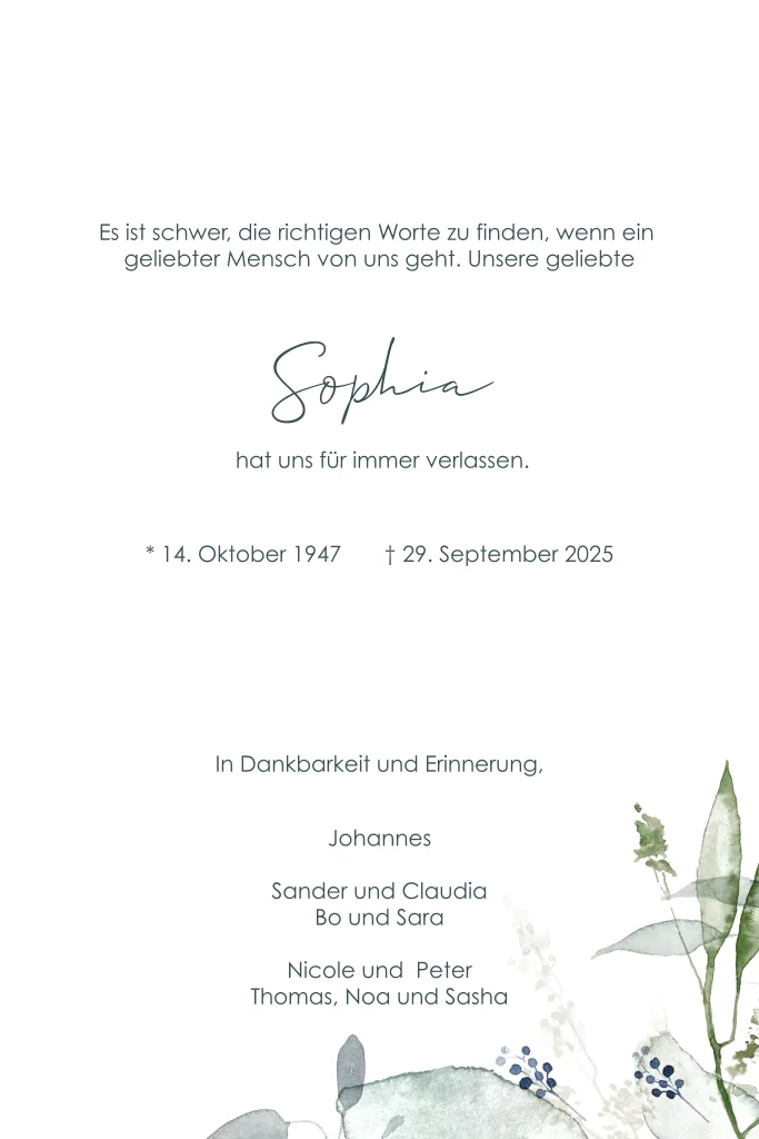 Trauerkarte mit Zweigen und Oneliner.Melde dich für unseren Newsletter an und profitiere von exklusiven Angeboten, kreativen Ideen und Neuigkeiten aus unserer Produktwelt. Als Dankeschön für deine Anmeldung schenken wir dir einen kostenlosen Probedruck deiner Karte.