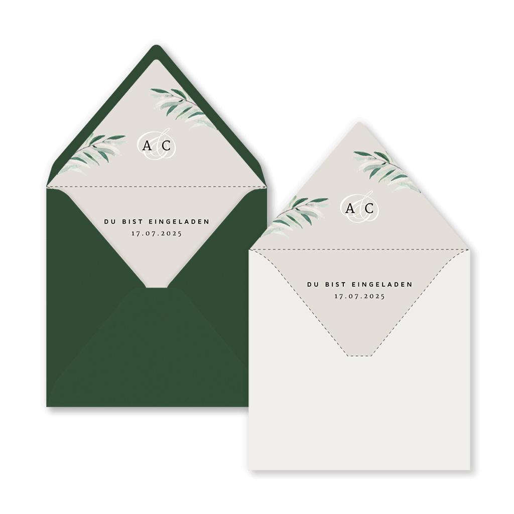 Öffnen, staunen und begeistert sein! Wir bieten Umschlag-Einlagen für die folgenden Umschlaggrößen an: 12x18, 14x14 und 22x11. Auf Anfrage können wir dieses Design in ein anderes Format ändern oder eine Einlage im Stil deiner Hochzeitskarte erstellen.