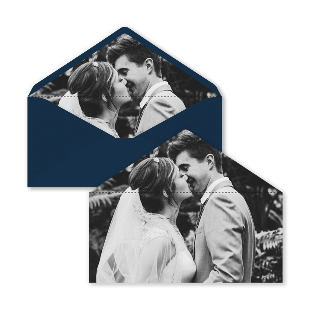 Öffnen, staunen und begeistert sein! Wir bieten Umschlag-Einlagen für die folgenden Umschlaggrößen an: 12x18, 14x14 und 22x11. Auf Anfrage können wir dieses Design in ein anderes Format ändern oder eine Einlage im Stil deiner Hochzeitskarte erstellen.