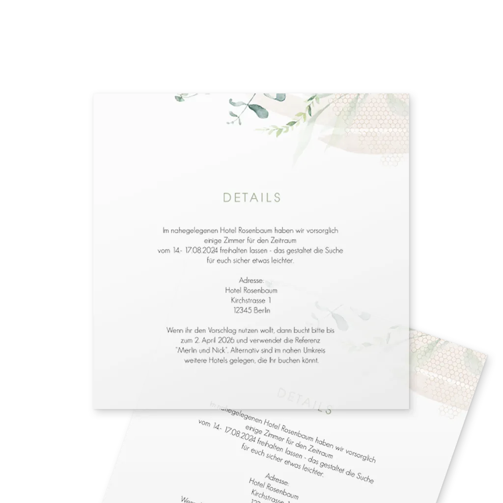 Hinweis: Ein Einlegeblatt ist das perfekte Extra für deine Hochzeitseinladungen. Auf den dünnen Einlegern hast du die Möglichkeit, extra Infos für die Gäste hinzuzufügen.