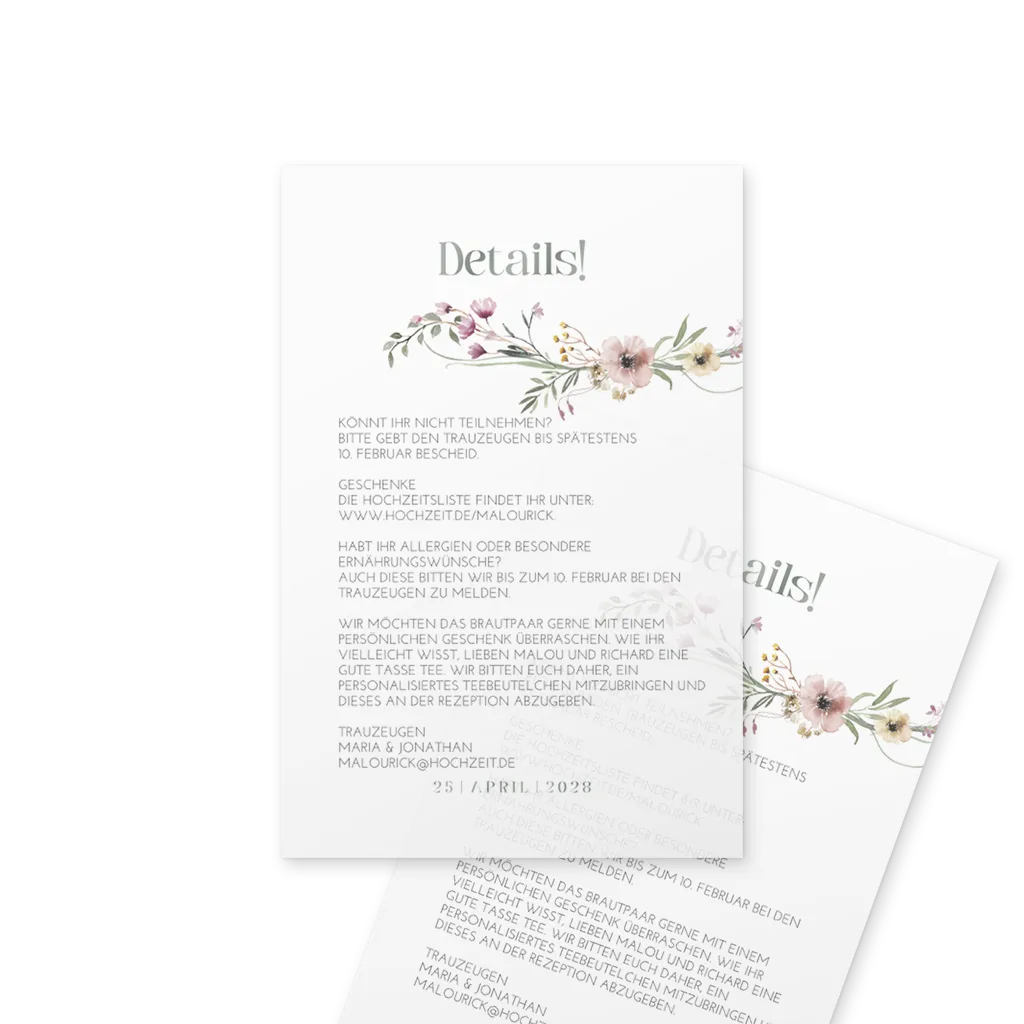 Hinweis: Ein Einlegeblatt ist das perfekte Extra für deine Hochzeitseinladungen. Auf den dünnen Einlegern hast du die Möglichkeit, extra Infos für die Gäste hinzuzufügen.