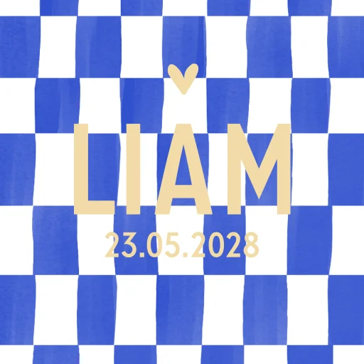 Fotofliese mit Namen und Herz auf blau kariertem Hintergrund