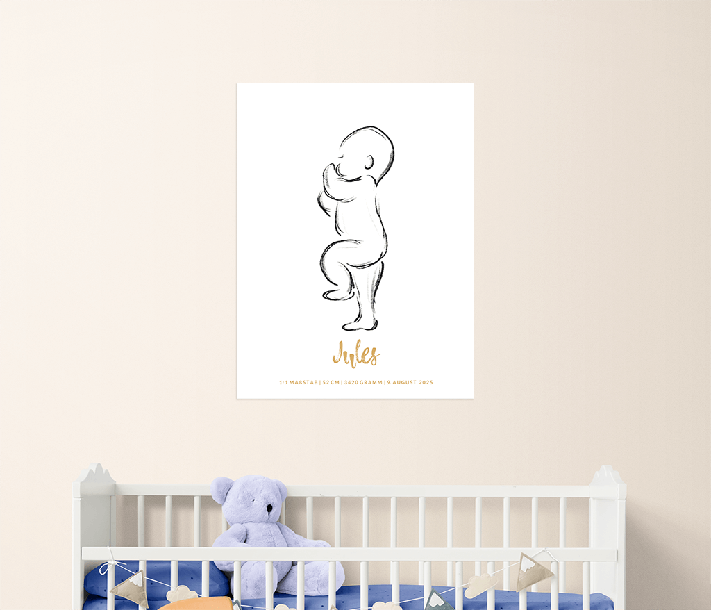 Ein Geburtsposter im Maßstab 1:1, um für immer festzuhalten, wie klein dein Baby zum Zeitpunkt der Geburt war.
