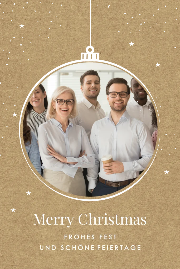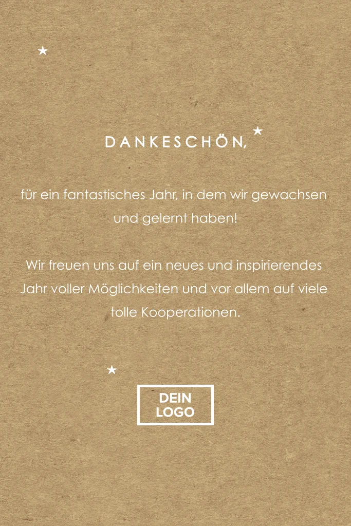 Versende eine schöne Firmen-Weihnachtskarte und wünsche deinen Kollegen und Kunden ein frohes Weihnachtsfest. Wunschkarten auf Vintage Kraftpapier bestechen durch einen trendigen Designkarton im rustic Kraftpapier-Look und sind mit modernen Schriftzügen bestückt absolut im Trend.Das Design der von dir gewählten Karte wurde automatisch in andere Formate umgestellt. Wähle einfach deinen Wunschformat aus und platziere alle Texte und Elemente an der richtigen Stelle im Editor. Du hast Fragen oder dein Favorit steht nicht zur Auswahl? Dann kontaktiere uns bitte und wir werden uns gemeinsam darum kümmern!