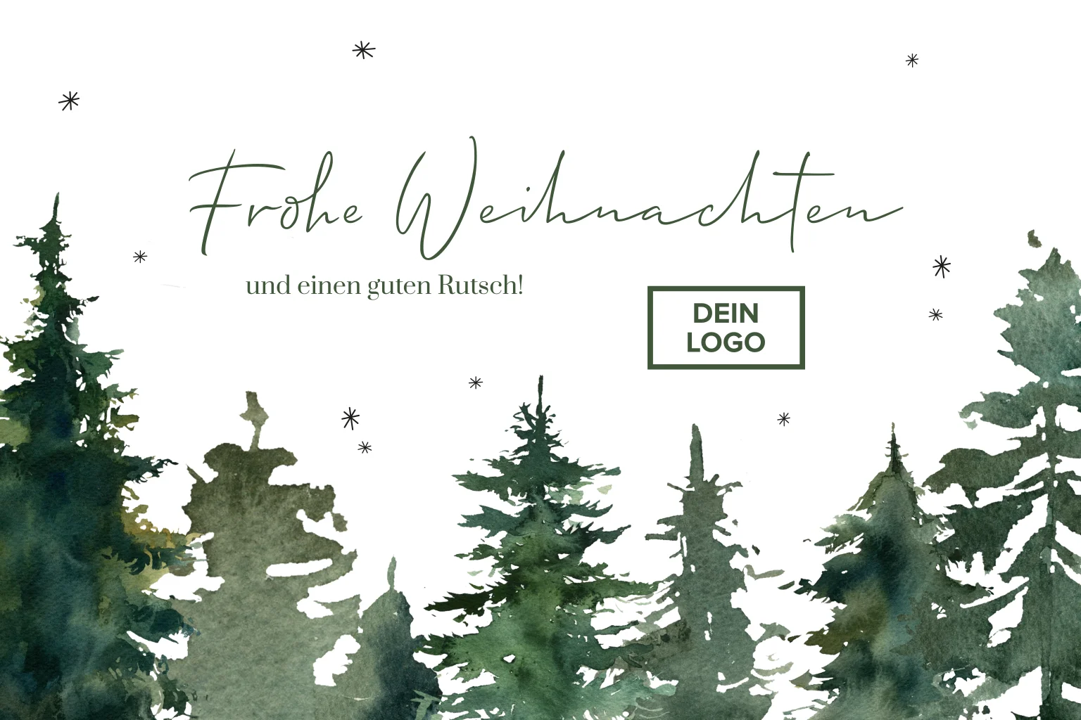 Diese stilvolle Weihnachtskarte ist perfekt für dich, wenn du Wert auf Nachhaltigkeit und Individualität legst. Die Aquarell-Illustration eines winterlichen Tannenwaldes verleiht der Karte einen eleganten und natürlichen Look. Der Text „Frohe Weihnachten und einen guten Rutsch!“ kann angepasst werden, und das Design bietet Platz für dein Firmenlogo. Du kannst die Karte nach deinen Wünschen anpassen und bei Kunden und Partnern einen bleibenden Eindruck hinterlassen. Ideal, um deine Weihnachtsgrüße persönlich und in einem nachhaltigen Look zu gestalten.