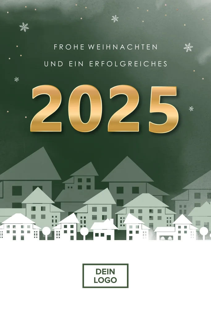 Geschäftliche Weihnachtskarte mit Häuschen, Jahreszahl und Logo
