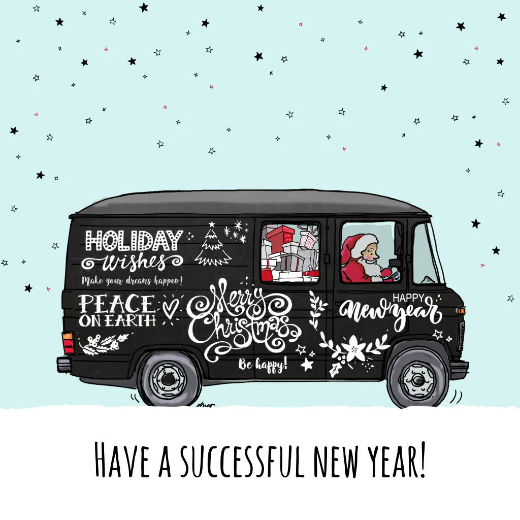 Geschäftliche Weihnachtskarte mit schwarzem Auto und Weihnachtsmann