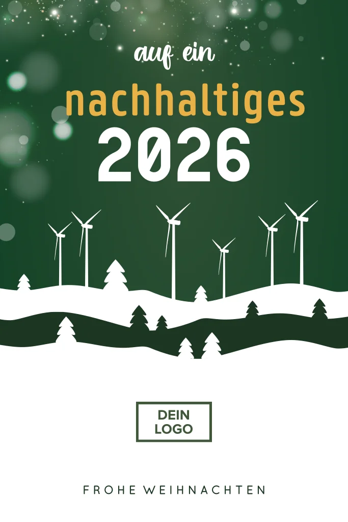 Geschäftliche Weihnachtskarte mit Weihnachtsbäumen und Windturbinen