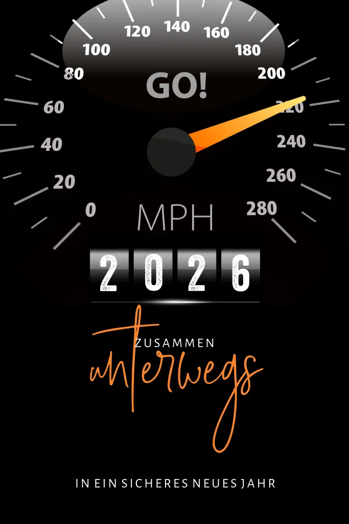 Geschäftliche Neujahrskarte im Auto-Stil mit Tacho und Kilometerzähler