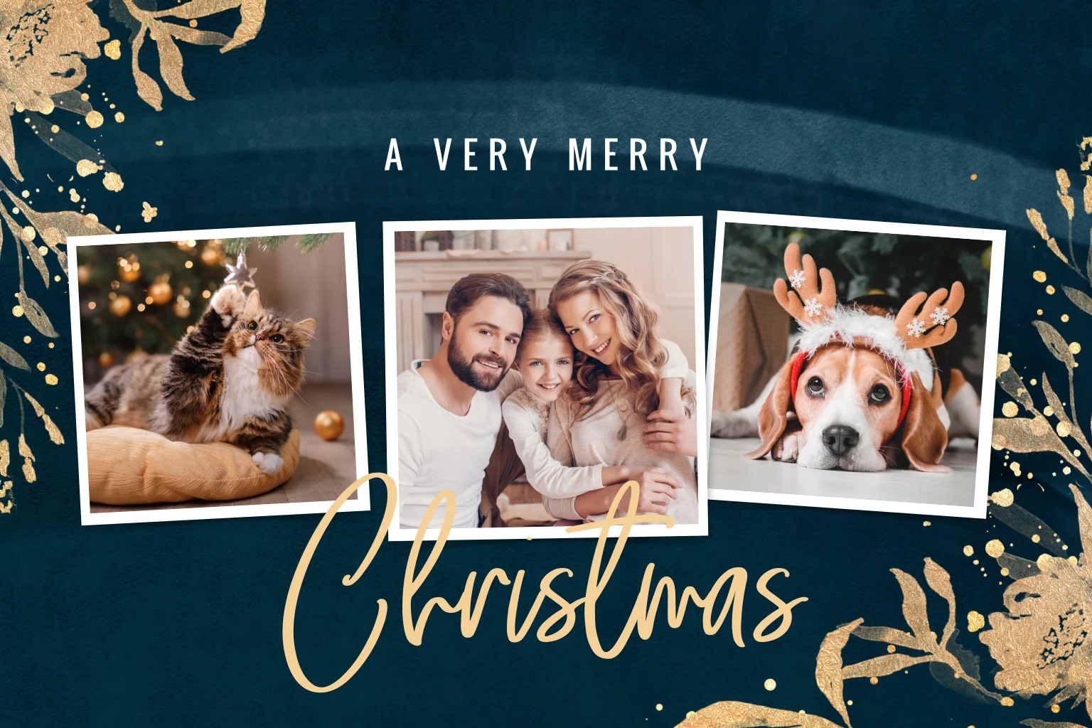 Aussergewöhnliche Weihnachtskarte mit drei Fotos und Blumenrand