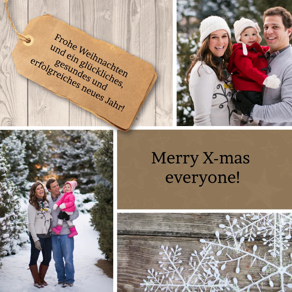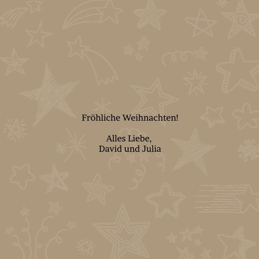 Eine moderne, gemütliche Weihnachtskarte mit verschiedenen Abschnitten. In einigen Abschnitten können Sie Ihre eigenen Fotos platzieren. In anderen gibt es Bilder von Holz mit einem coolen Etikett oder mit weißen Schneesternen. Bekommen Sie auch schon Lust auf Weihnachten?Bei quadratische Karten fällt ggf. ein anderes Briefporto an. Alle Infos findest du auf der Website der Deutschen Post. Zu diesem Format erhältst du Umschläge in der Größe 14x12,5 cm. Format ändern ist möglich.