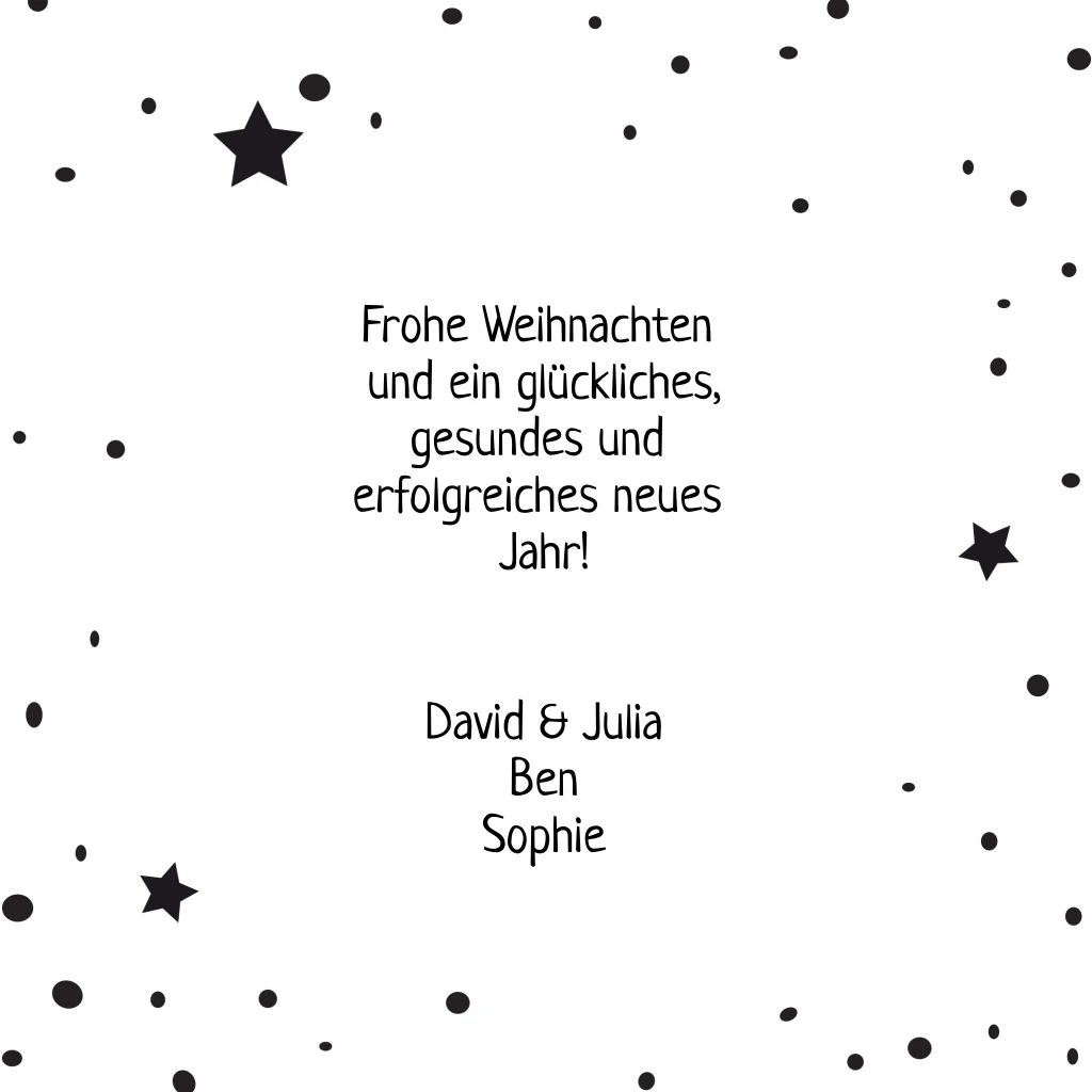 Eine moderne Weihnachtskarte in Schwarzweiss mit einem Kreis, in dem Sie ein persönliches Foto platzieren können. Die Weihnachtselemente rund um den Kreis sind in schwarz gehalten: der Weihnachtsmann im Schlitten mit Rentier, Weihnachtsbäume, Geschenke und vieles mehr! Die Punkte und Sterne im Hintergrund runden das Bild ab!Bei quadratische Karten fällt ggf. ein anderes Briefporto an. Alle Infos findest du auf der Website der Deutschen Post. Zu diesem Format erhältst du Umschläge in der Größe 14x12,5 cm. Format ändern ist möglich.