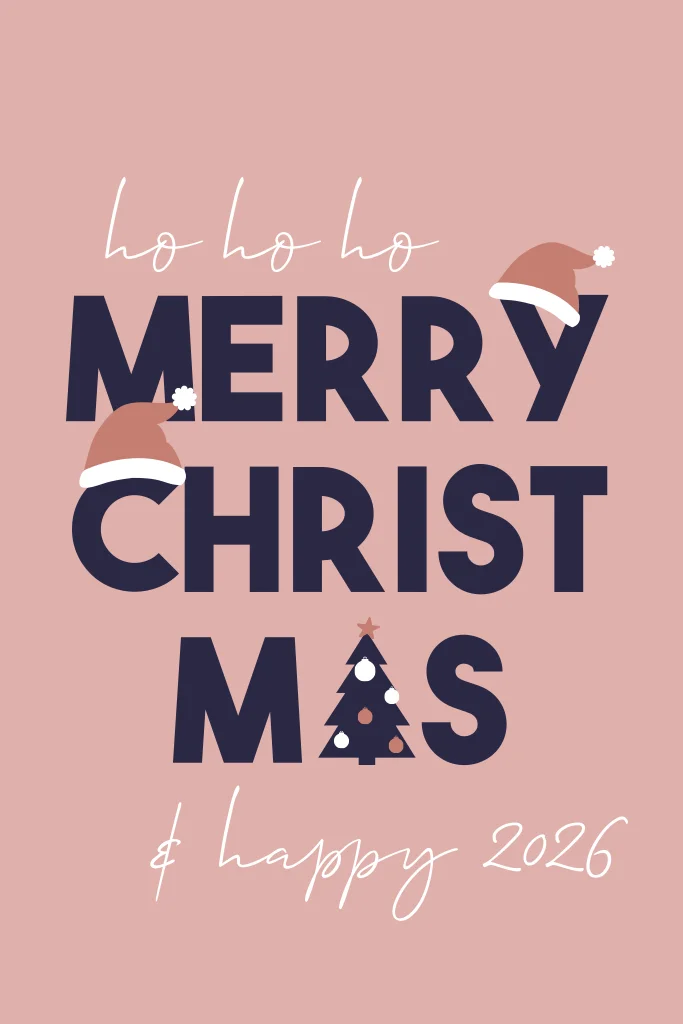 Moderne Weihnachtskarte mit Weihnachtsmannmützen und Tannenbaum