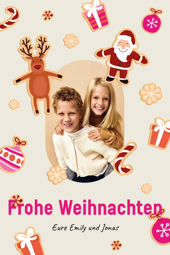Niedliche Weihnachtskarte mit Rentier, Geschenken und eigenem Bild