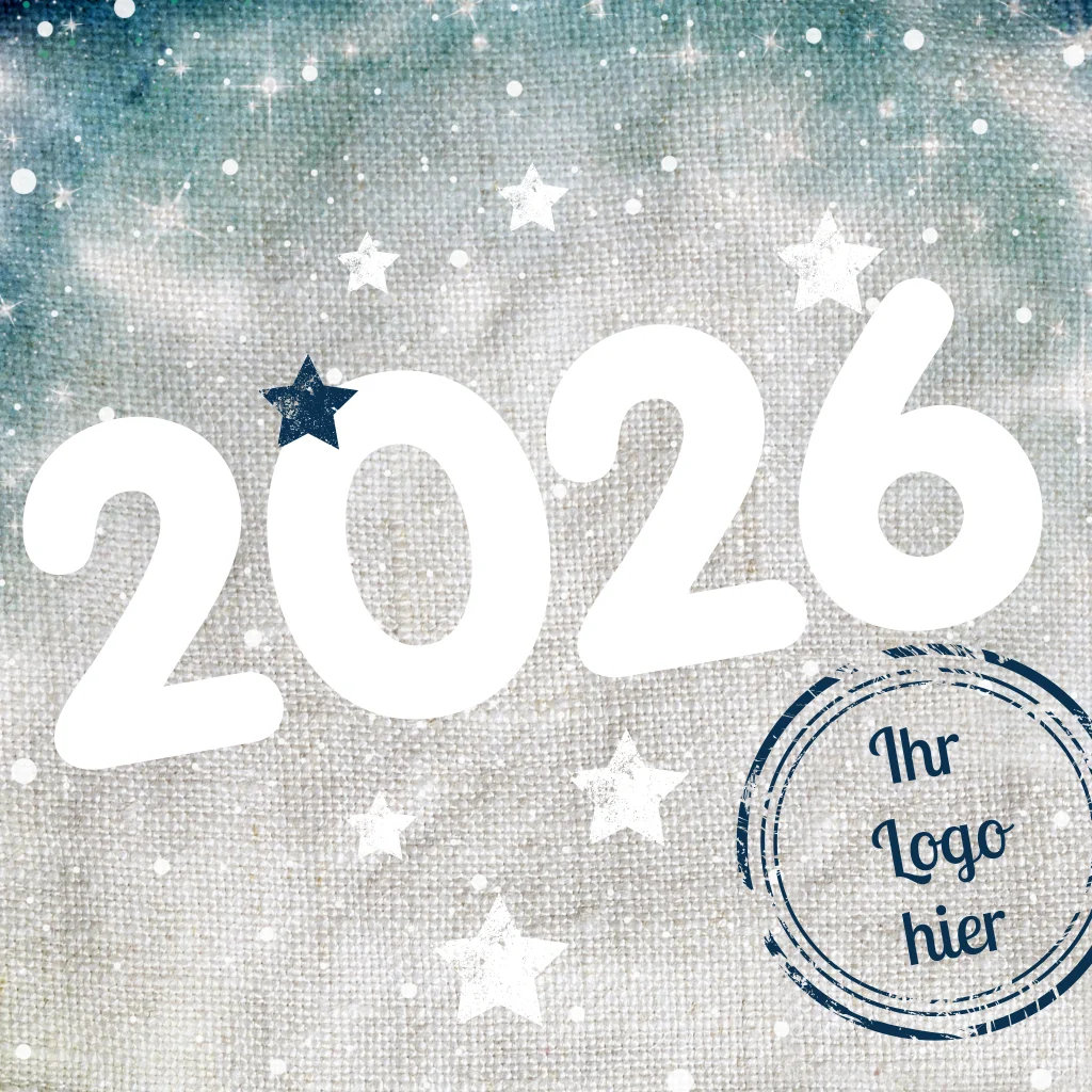 Was für eine hippe Weihnachtskarte mit einem Hintergrund aus Stoff mit weissen Sternen und Punkten. In der Mitte eine große Jahreszahl! In den Stempel kann man ein Firmelogo platzieren und Texte und Schriftarten lassen sich im Online-Editor ganz einfach anpassen.