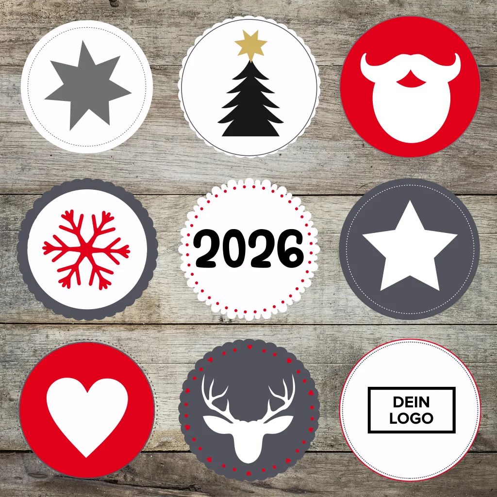 Ein Holzhintergrund mit vielen weihnachtlichen Kreisen. In den Kreisen befinden sich verschiedenen weihnachtliche Symbole. Diese Karte ist echt cool und hipp! Rechts unten ist Platz für ein Firmenlogo.