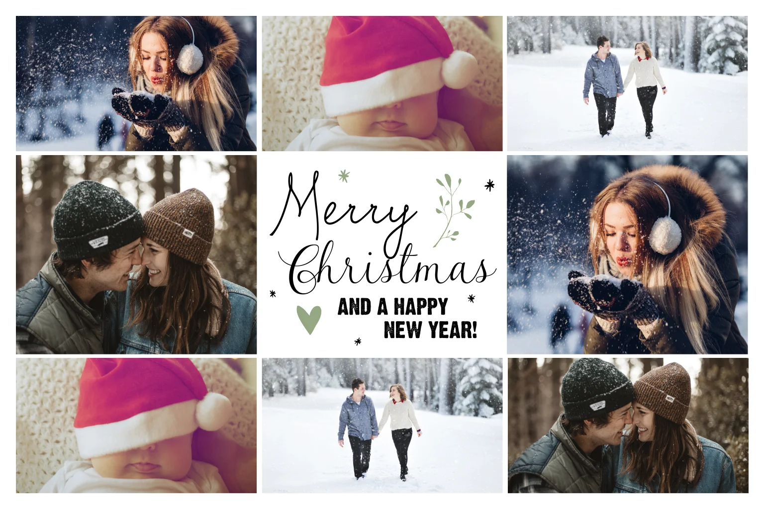 Happiness pur - viele Fotos und ein fröhliches „Merry Christmas and a happy New Year" für Ihre Weihnachtskarte. Grüne Farbakzente wie Herzen, Sterne und Zweige heben die schwarzen Grußsprüche wirkungsvoll hervor.Melde dich für unseren Newsletter an und profitiere von exklusiven Angeboten, kreativen Ideen und Neuigkeiten aus unserer Produktwelt. Als Dankeschön für deine Anmeldung schenken wir dir einen kostenlosen Probedruck deiner Karte.